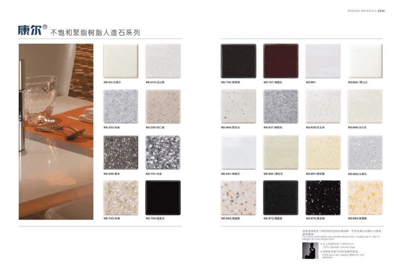 康爾人先后開發(fā)出了色彩豐富的 100% 純亞克力系列,復(fù)合亞克力系列,不飽和樹脂系列,石英石、集成成品臺面和高分子復(fù)合材料門板系列。產(chǎn)品系列多樣、顏色豐富、品質(zhì)穩(wěn)定、已銷往世界幾十個國家,深受國內(nèi)外客戶的好評.