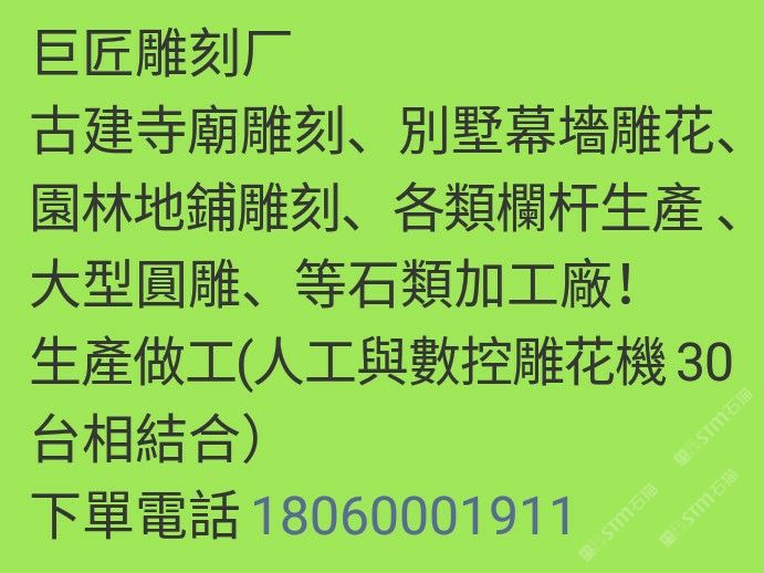 5年專業(yè)石業(yè)雕刻加工,寺廟古建、幕墻建材、園林欄桿,等石材雕刻類加工。歡迎洽談合作!有意直接電話!微聊長時(shí)間沒登