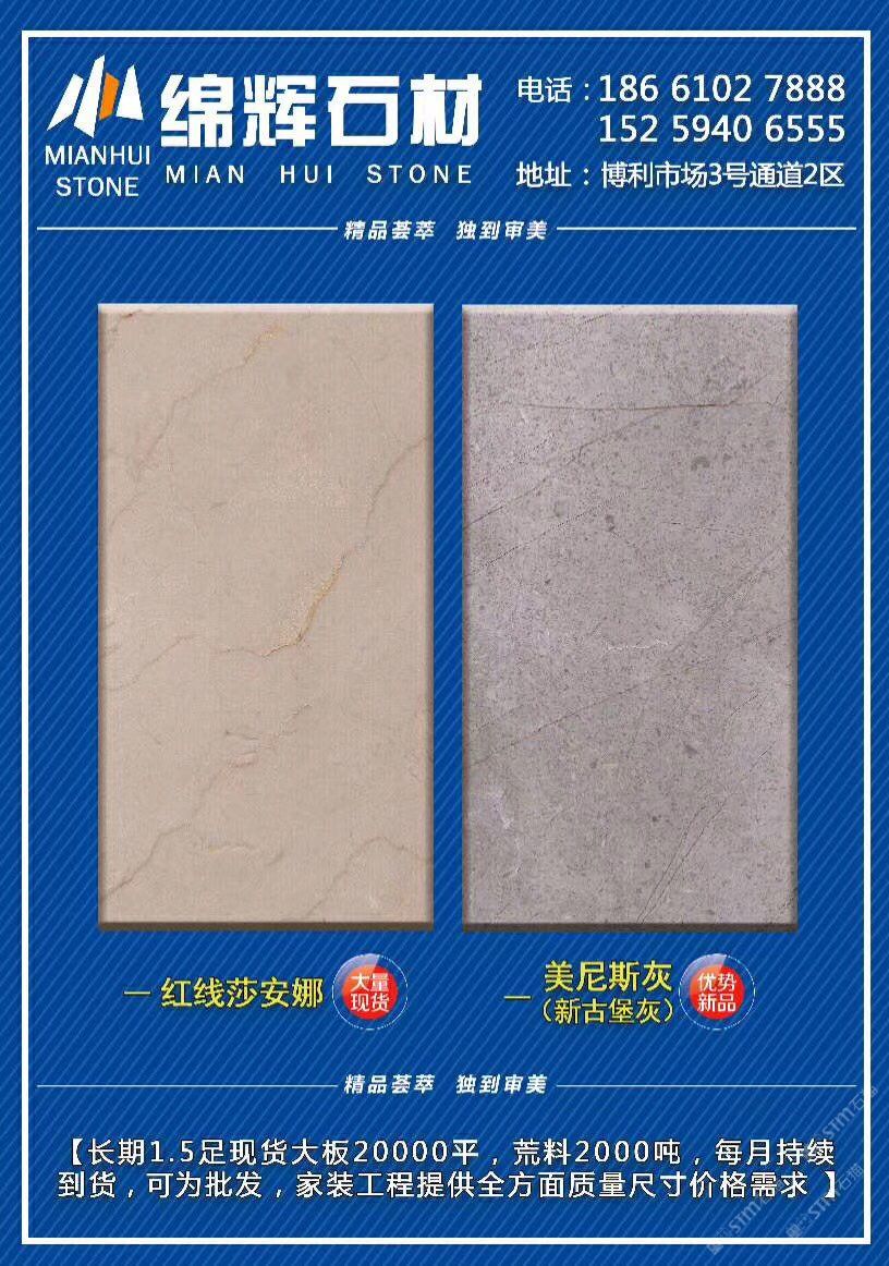 主營《紅線莎安娜》《美尼斯灰·新古堡灰》《金歐典》,每月持續(xù)到貨,日均庫存大板20000平,荒料2000噸??蔀榕l(fā),零售,工程單提供各種板面質(zhì)量/規(guī)格/價位需求!