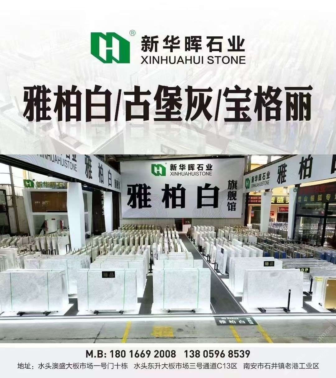 福建南安【賣場(chǎng)地址】水頭鎮(zhèn)澳盛大板市場(chǎng)2號(hào)門直走8棟新華暉白石空間