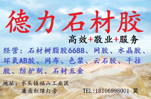 經營范圍:石材樹脂膠,透明膠,水晶膠,工藝樹脂膠,薄板復合膠,防水背膠,臺灣AB膠,網布,色漿,防護劑,意大利進口水性AB膠,云石膠,干掛膠,石材色差處理,外墻清洗