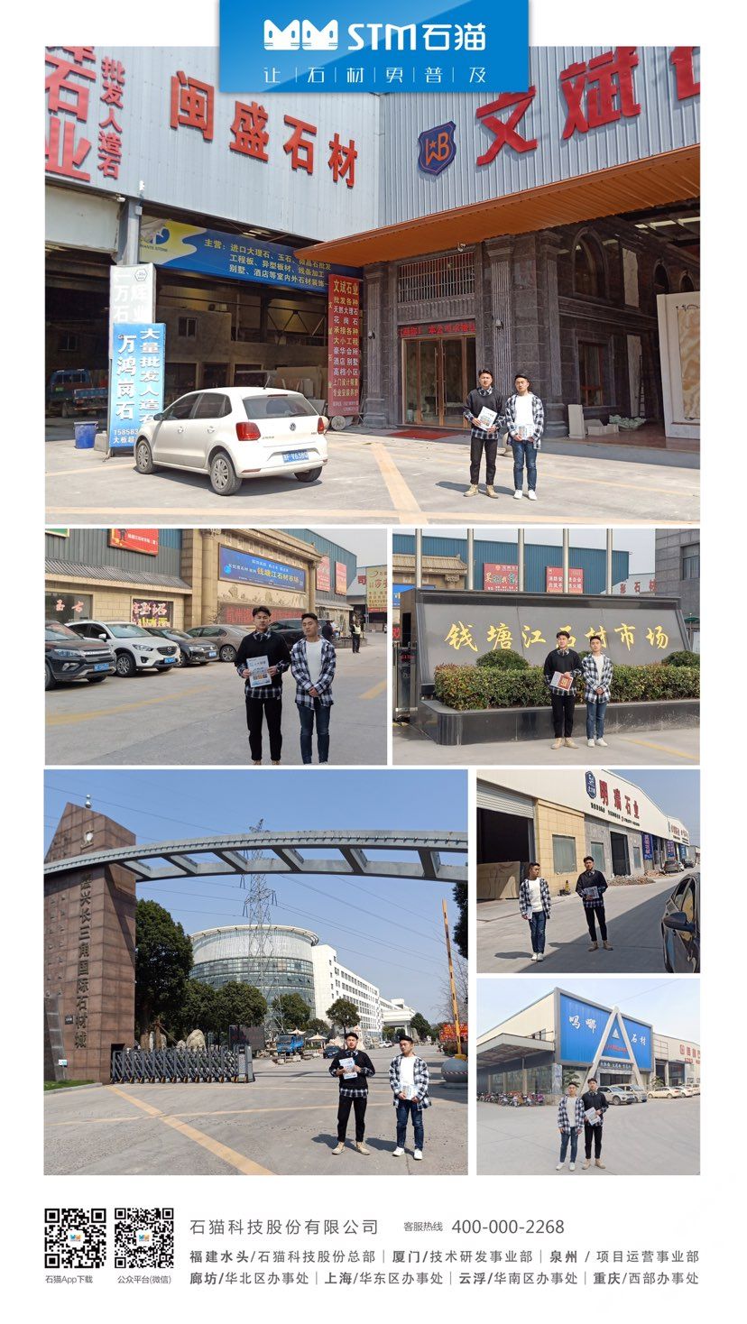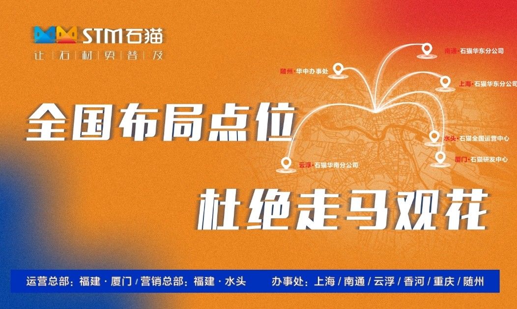華東分公司先后與華東石材市場(chǎng)合作,包括上海東華環(huán)球石材市場(chǎng)、中首萬(wàn)石國(guó)際石材市場(chǎng)、南通東升產(chǎn)業(yè)園、六泉國(guó)際石材市場(chǎng)等,隨后又與華東知名石材企業(yè)南通新景石材有限公司、隆川石材、康典石業(yè)、新鵬飛石業(yè)、宜興隆嘉石業(yè)、新澤海石業(yè)、南通杰恒石業(yè)、珍品玉石合作,打造共贏局面。石貓致力于與各大優(yōu)秀石企共同進(jìn)步,共同發(fā)展,尋求石材行業(yè)新發(fā)展。