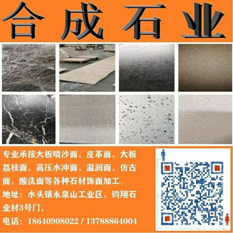 專業(yè)承接皮革面、溫潤面、噴沙面,鋼砂面、高壓水沖面,大板荔枝面,絲綢面,溫潤面,磨砂面,布紋面,斧鑿面(龍眼面),仿古面等各種飾面加面