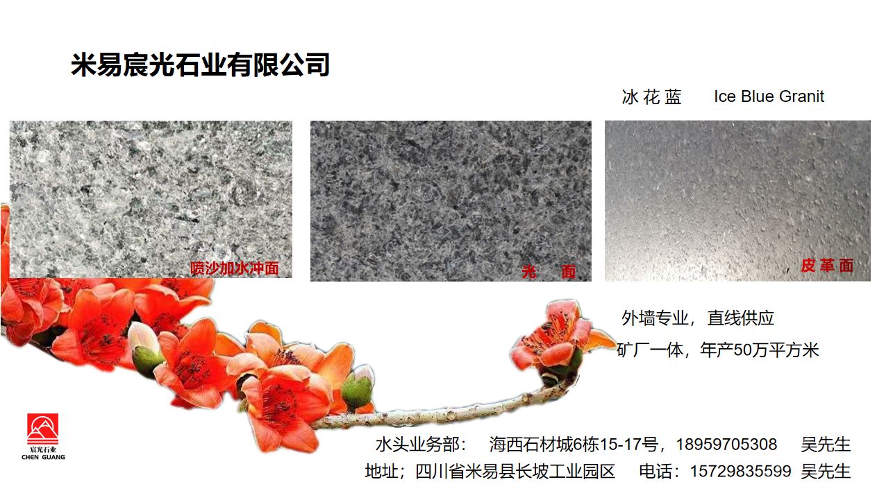米易宸光石業(yè)有限公司是一家礦山加工廠為一體的大型石材企業(yè)。公司主營:冰花蘭、豹皮花、太平洋藍(lán)花崗石。年產(chǎn)50萬平方米。適用外墻干掛、內(nèi)裝公共區(qū)域、景觀園林、市政道路。出口:美歐、日本、韓國、新加坡、馬來西亞等國家。深受國內(nèi)沿海城市喜歡。