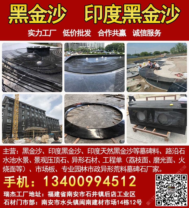 發(fā)布信息: 瑞杰黑金沙林總13400994512專業(yè)印度黑金沙供應(yīng)商,實力石材工廠主要加工:黑金沙、黑金砂、印度黑金沙、印度天然黑金沙、印度黑色石材、印度黑石、黑金沙石材、黑金沙花崗巖、新礦黑金砂、國產(chǎn)黑金沙、新黑金沙石材等墓碑料、路沿石、水池水景、景觀壓頂石、異形石材、工程單(荔枝面、磨光面、火燒面等)、市場板、專業(yè)園林市政異形荒料墓碑石廠家,實力工廠、低價批發(fā)、合作共贏、誠信服務(wù). 工廠地址:福建省南安市石井鎮(zhèn)后店工業(yè)區(qū),門市部:南安市水頭鎮(zhèn)閩南建材市場