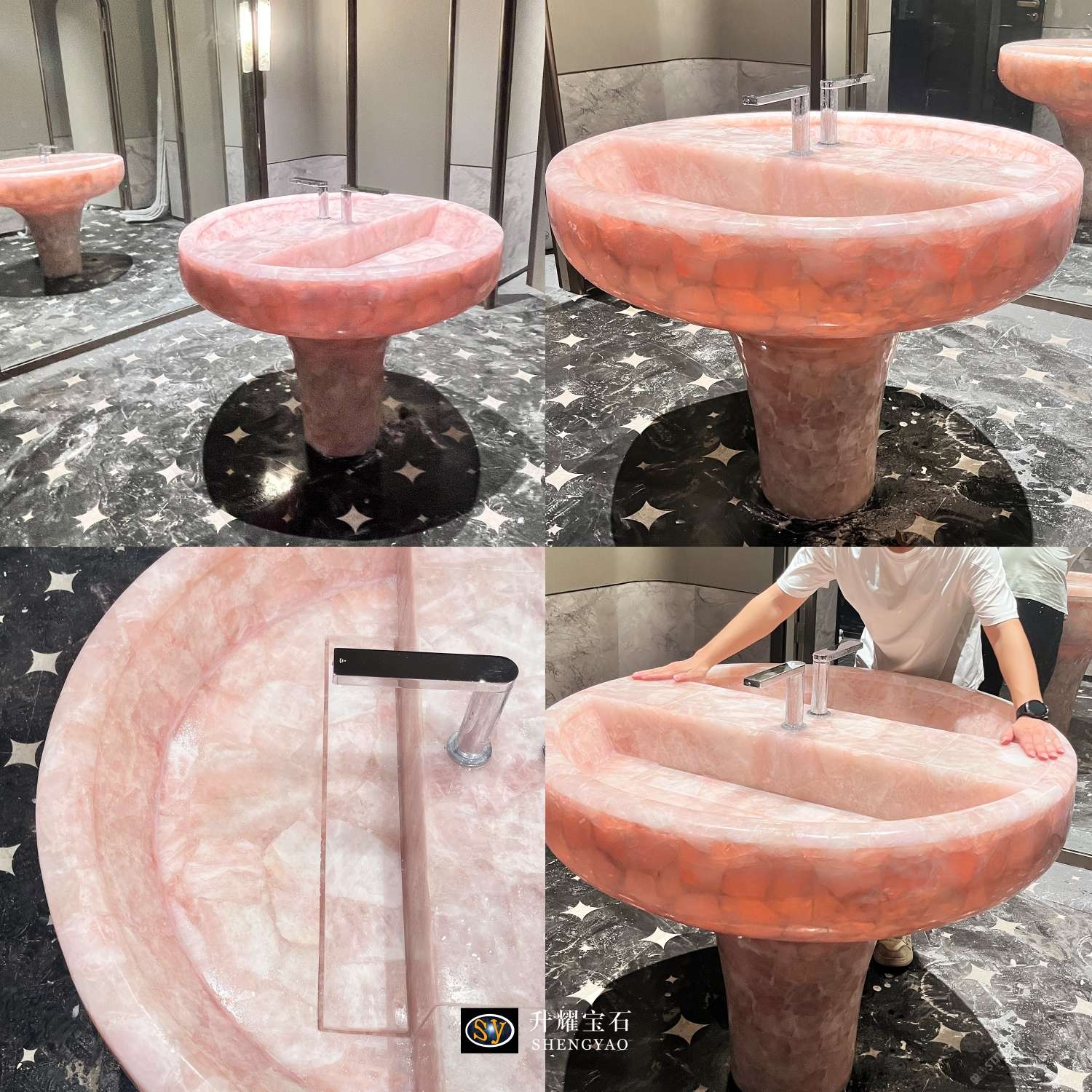 發(fā)布信息: 這是一款用粉水晶制作而成的洗手臺(tái),根據(jù)客戶需求定制尺寸及形狀,