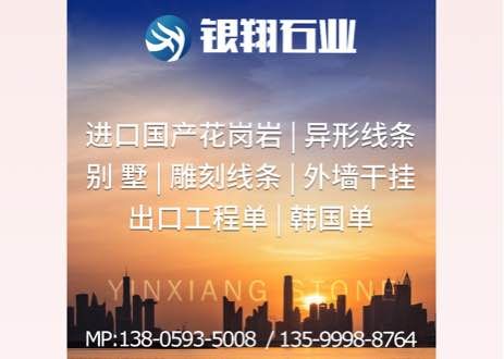 銀翔石業(yè) 聯(lián)系人:周    138****5008 查看 手機號碼:無 主營范圍: 花崗巖加工、荒料、異型加工、石材外貿(mào)、 企業(yè)地址:福建泉州南安市石井鎮(zhèn)三鄉(xiāng)村章文銀翔石材