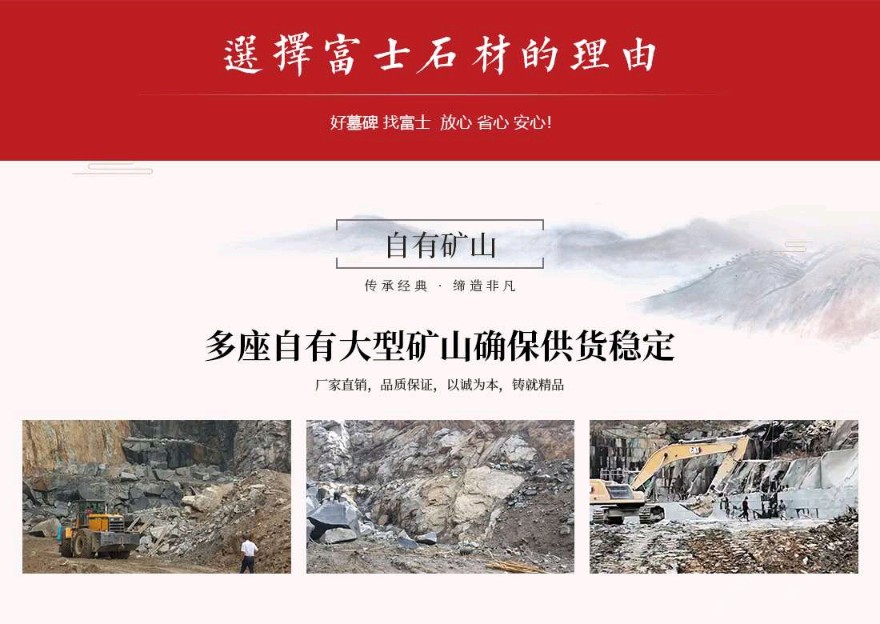 發(fā)布信息: 富士石材位于世界石雕之都——福建惠安,于1996年成立,主營(yíng)墓碑生產(chǎn)、墓碑研發(fā)設(shè)計(jì)、公墓運(yùn)營(yíng)&殯儀館運(yùn)營(yíng)、公墓陵園景觀、規(guī)劃設(shè)計(jì)等一條龍殯葬服務(wù)。公司自成立以來不斷引進(jìn)當(dāng)今世界先進(jìn)的生產(chǎn)設(shè)備及加工工藝,用專業(yè)的設(shè)備造優(yōu)秀的產(chǎn)品。公司擁有一大批經(jīng)驗(yàn)豐富的技術(shù)型管理人才,以嚴(yán)謹(jǐn)?shù)墓芾硖峁└咝У姆?wù),并配以先進(jìn)的電腦設(shè)計(jì)及現(xiàn)代化企業(yè)管理模式,秉承 “以客戶為中心、以質(zhì)量為根本,以市場(chǎng)為導(dǎo)向、以人文為基礎(chǔ)”的經(jīng)營(yíng)理念,經(jīng)過將近三十年的發(fā)展,逐步發(fā)展成為一家集墓碑加工生產(chǎn)、研發(fā)設(shè)計(jì)、陵園規(guī)劃設(shè)計(jì)、公墓運(yùn)營(yíng)&殯儀館運(yùn)營(yíng)為一體的公司。