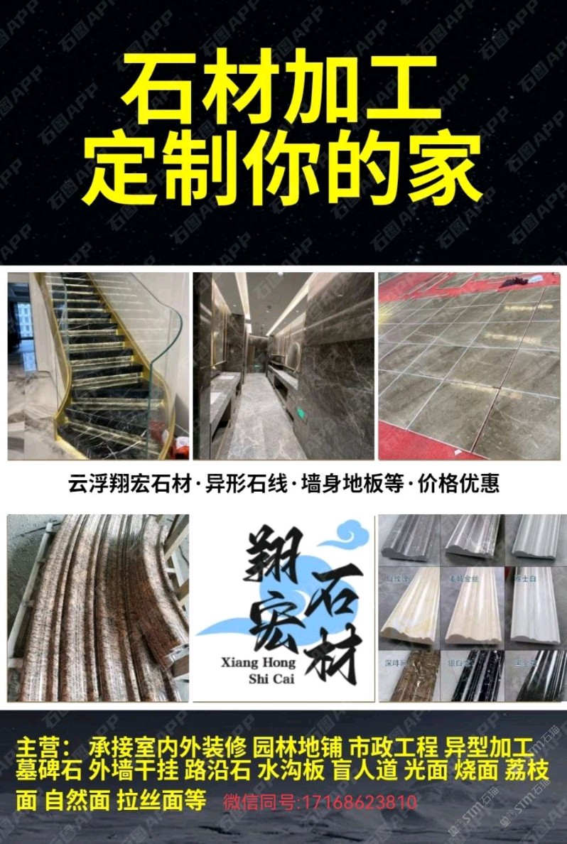 發(fā)布信息: 翔宏石材加工部,切割開料、專業(yè)對外加工、磨邊機對外加工、背景墻水溝蓋板、異型石線、線條、樓梯、室內(nèi)外墻體、洗手臺、盲人石/導盲石、地鋪石等